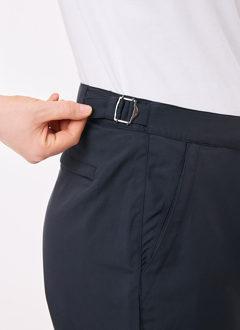 High waisted (adjustable waistband) pant with straight leg. See length comparison with other pants here.